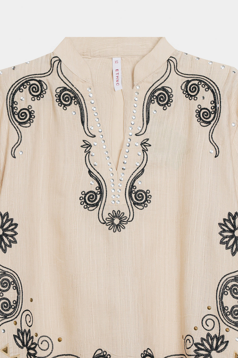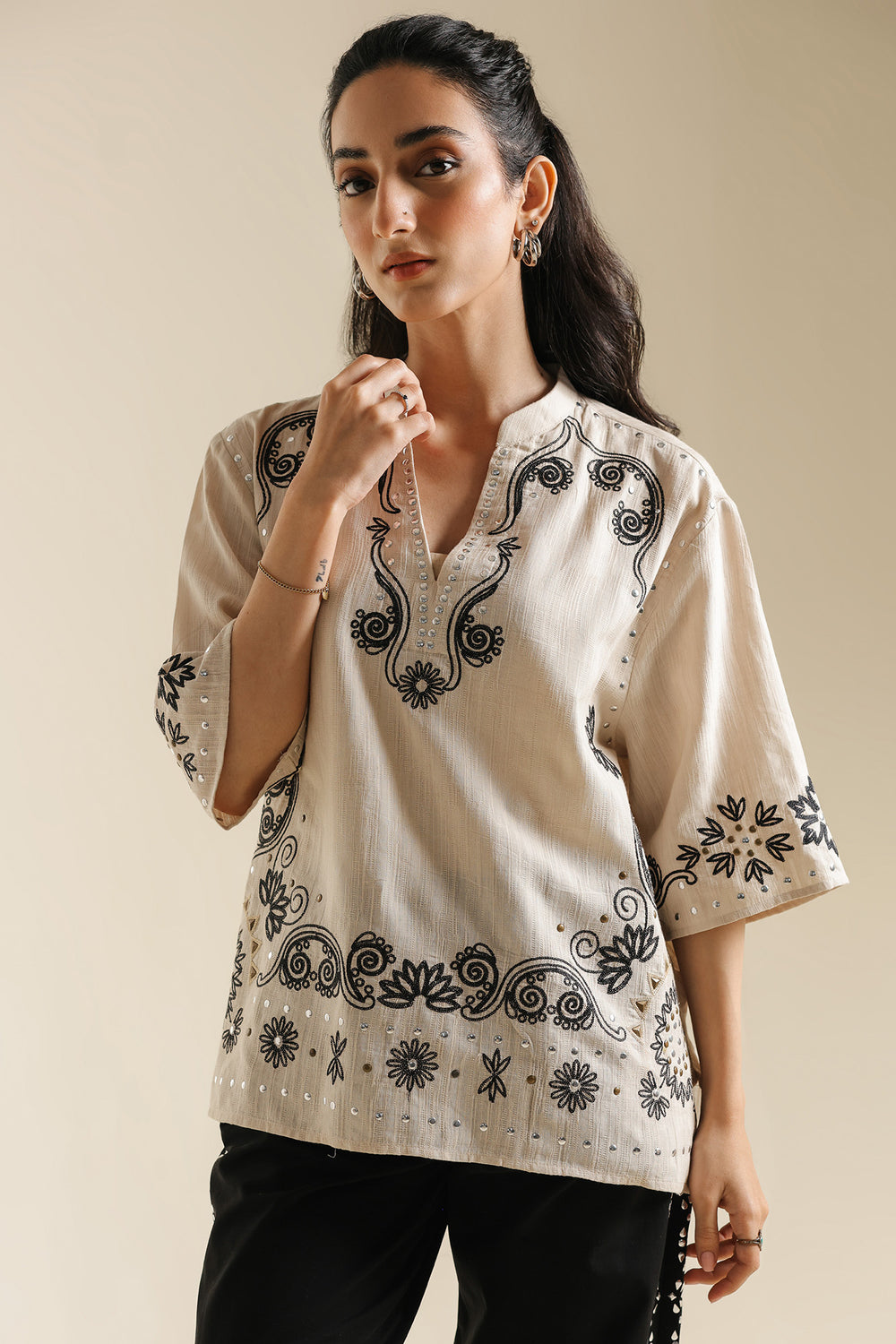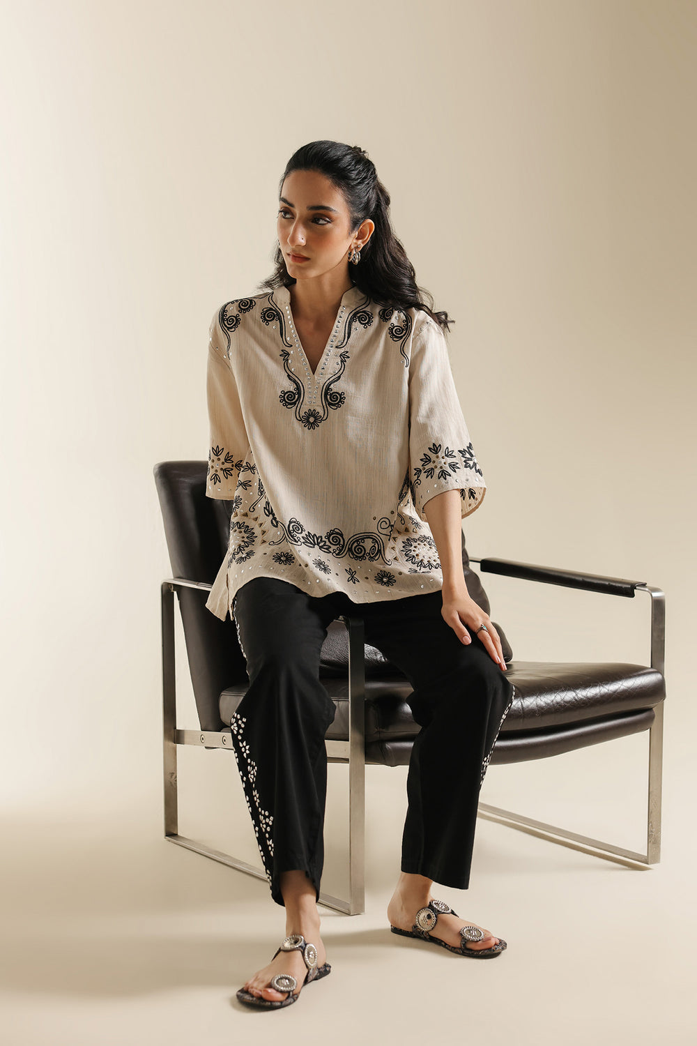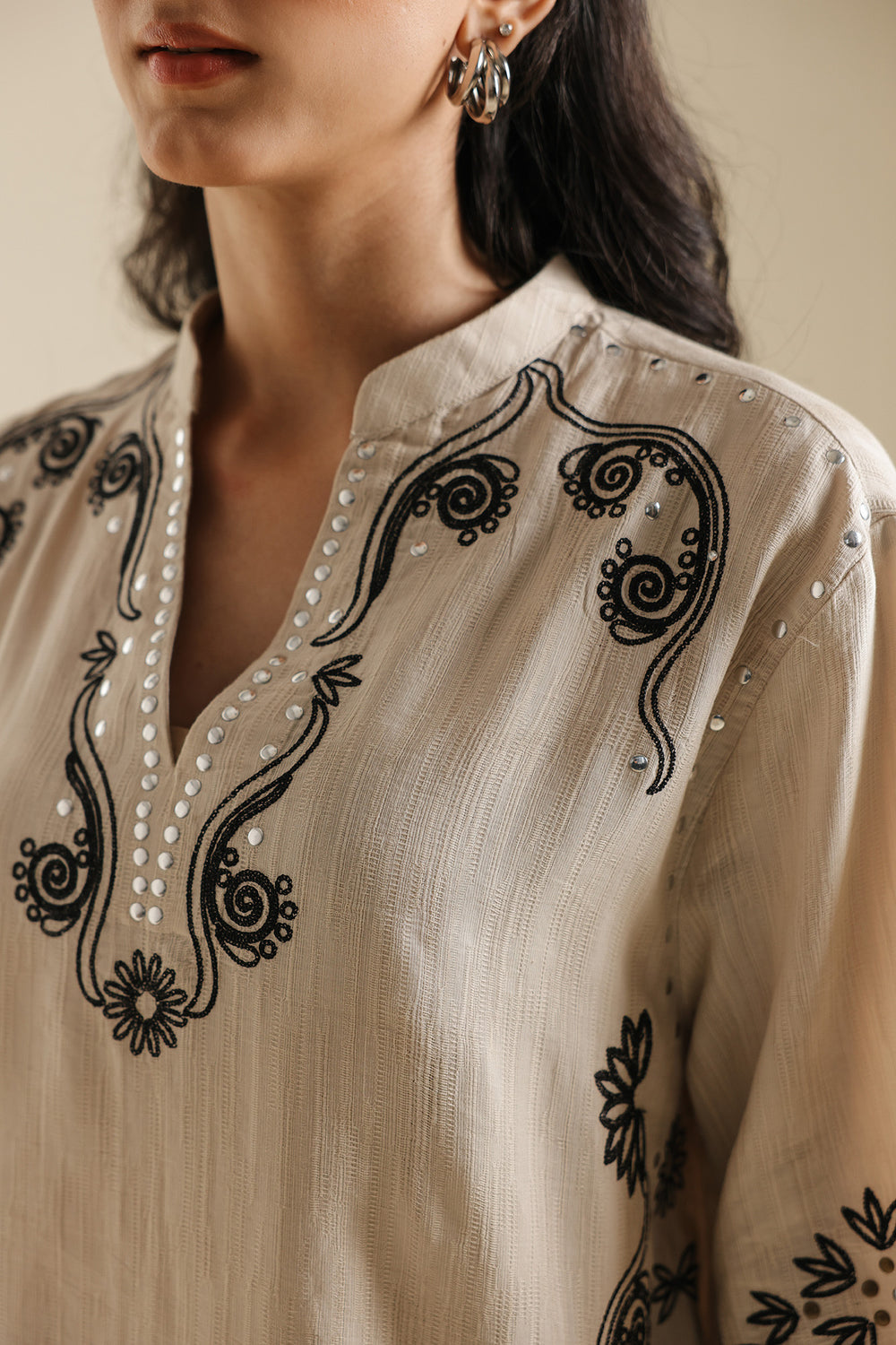 Exude effortless chic in this antique white top, a masterclass in tonal contrast and artisanal detailing. The shirt is crafted from a premium textured fabric that offers a rich, tactile feel and a structured silhouette. Its design is centered around a sophisticated V-neckline, framed by bold, swirling ethnic embroidery in deep ebony that extends across the front and back. The wide, elbow-length sleeves and the straight hemline are further enhanced by coordinating black floral motifs and delicate mirror-work accents that catch the light with every movement. This one-piece tunic provides a striking, modern look that balances traditional needlework with a contemporary, relaxed fit, making it an essential statement piece for your wardrobe.