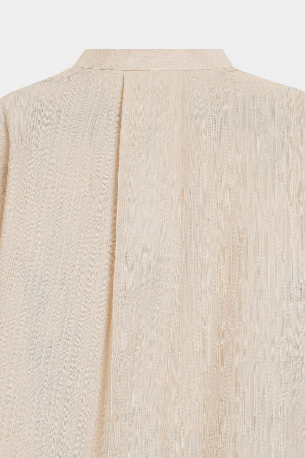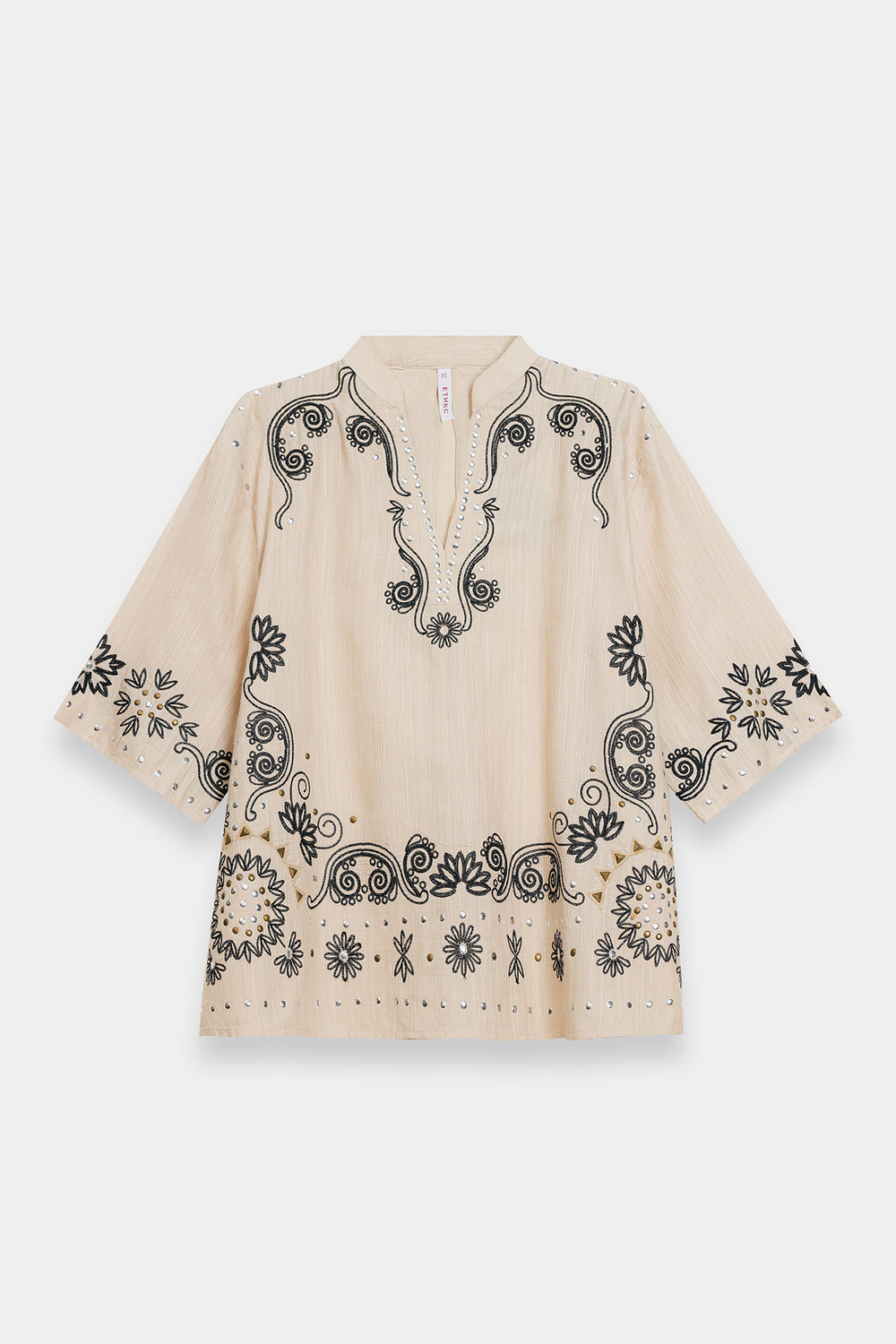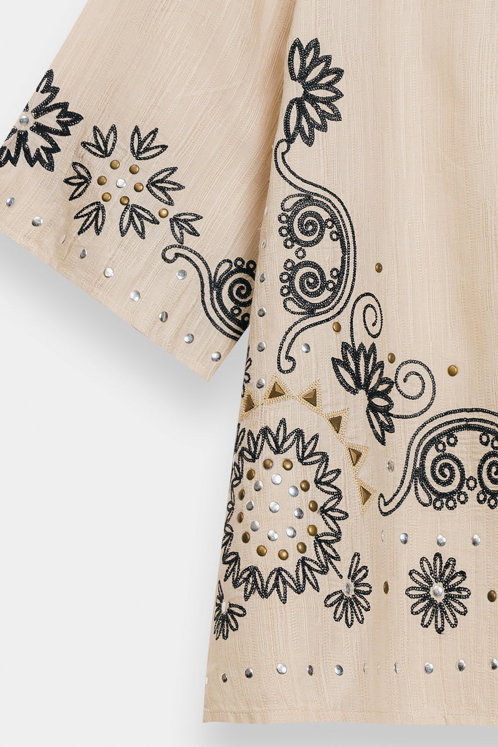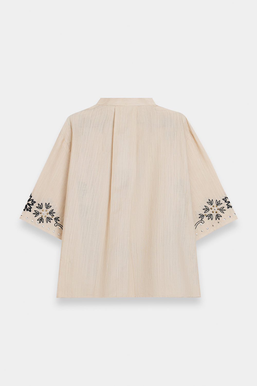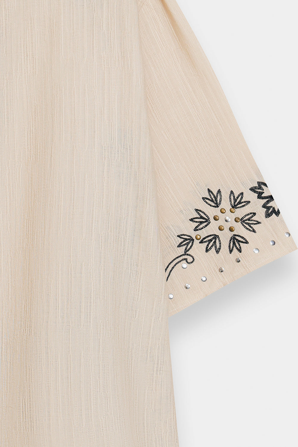 Exude effortless chic in this antique white top, a masterclass in tonal contrast and artisanal detailing. The shirt is crafted from a premium textured fabric that offers a rich, tactile feel and a structured silhouette. Its design is centered around a sophisticated V-neckline, framed by bold, swirling ethnic embroidery in deep ebony that extends across the front and back. The wide, elbow-length sleeves and the straight hemline are further enhanced by coordinating black floral motifs and delicate mirror-work accents that catch the light with every movement. This one-piece tunic provides a striking, modern look that balances traditional needlework with a contemporary, relaxed fit, making it an essential statement piece for your wardrobe.