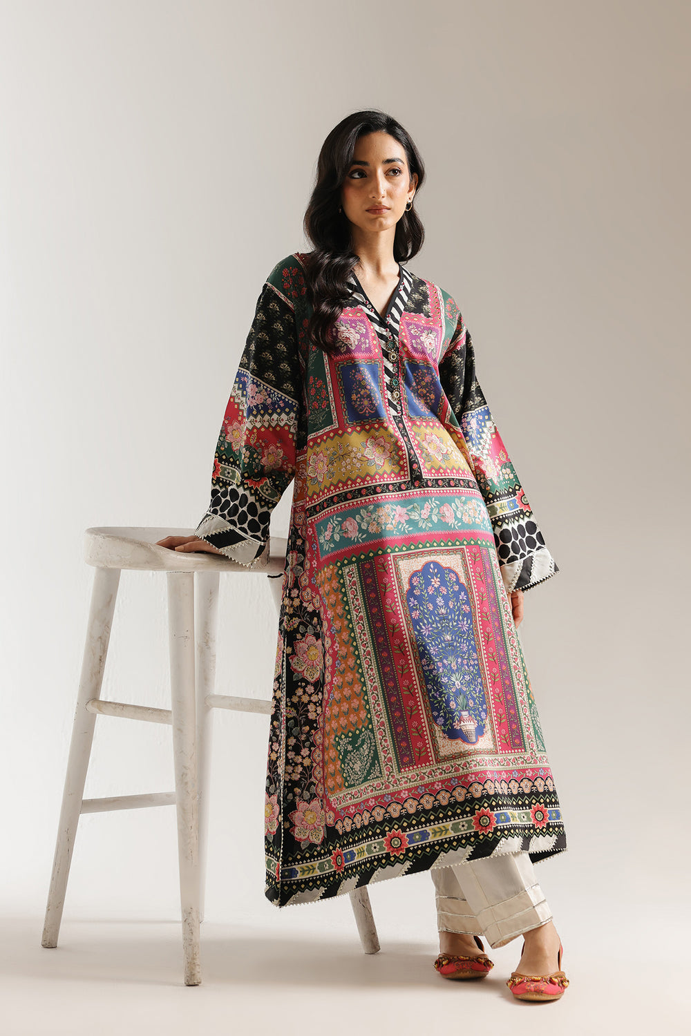 This striking two-piece ensemble showcases a vibrant A-line shirt featuring a sophisticated collage of traditional motifs, botanical illustrations, and geometric borders. The rich color palette of deep reds, forest greens, and golden mustards is beautifully anchored by a bold black and white striped V-neckline and wide flared sleeves. The look is grounded by elegant off-white straight-cut trousers, finished with delicate tonal lace detailing at the ankles for a refined touch.