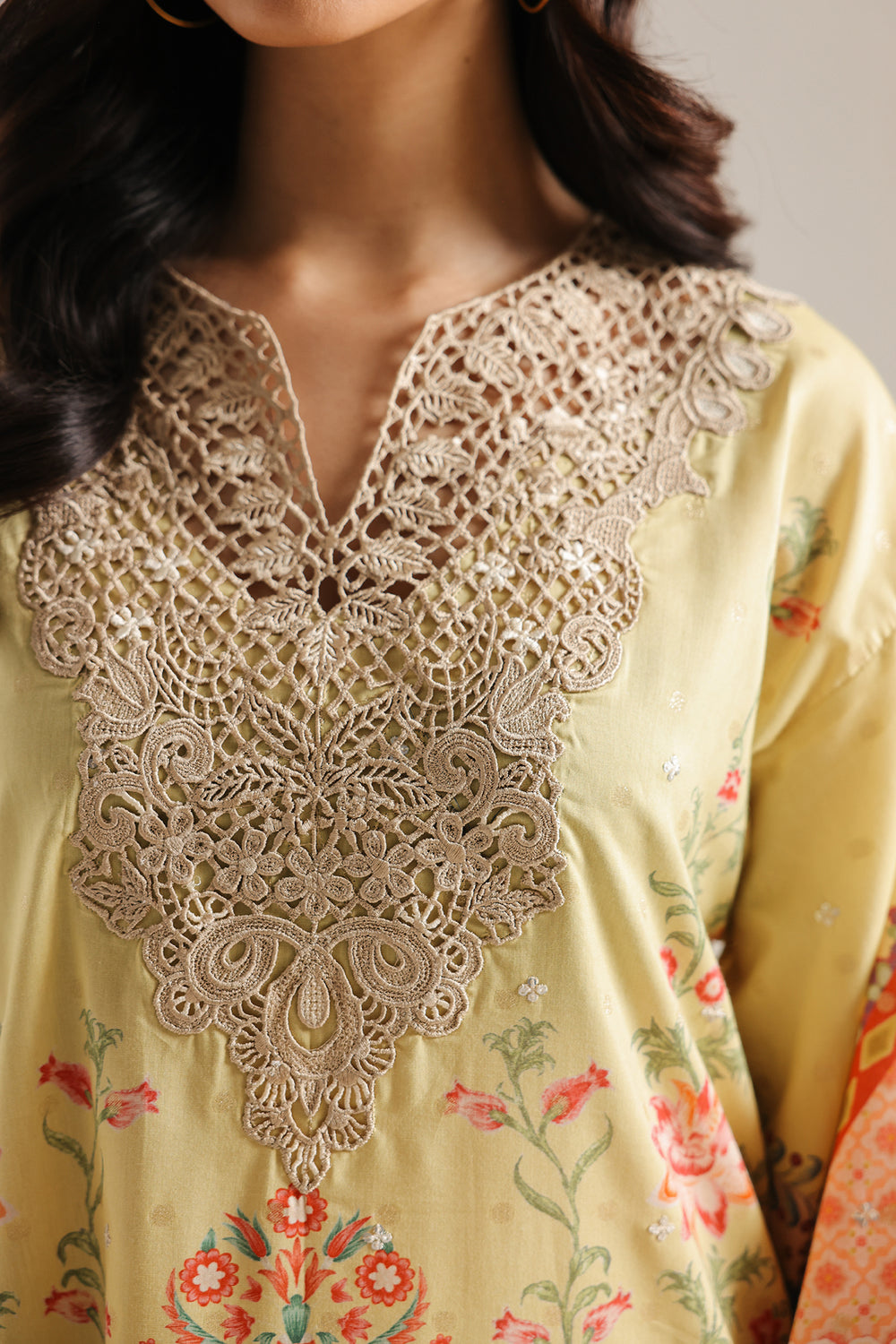 This elegant kaftan features a soft yellow palette adorned with intricate floral motifs and a regal, heavily embroidered neckline. The floor-length silhouette is defined by wide flared sleeves and a delicate scalloped hemline, both finished with ornate geometric borders and lace detailing for a sophisticated, airy feel.