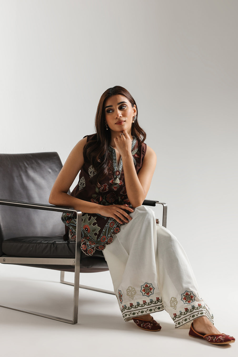 Step into a world of artisanal luxury with this striking mahogany brown ensemble, where traditional craftsmanship meets a bold, contemporary silhouette. The sleeveless shirt serves as a rich canvas for an intricate scenographic embroidery in shades of burnt coral, slate blue, and sage green, featuring a grand central medallion and symmetrical botanical flourishes. A sophisticated V-neckline is accented with delicate small tassel, while the hemline is finished with dramatic scalloped embroidery for a tactile, high-fashion edge. This ornate top is perfectly balanced by voluminous ivory shalwar, which feature coordinating floral embroidery at the ankles to create a cohesive and artistic profile. Whether styled for a festive daytime celebration or a refined social gathering, this suit ensures a presence that is both culturally resonant and undeniably chic.