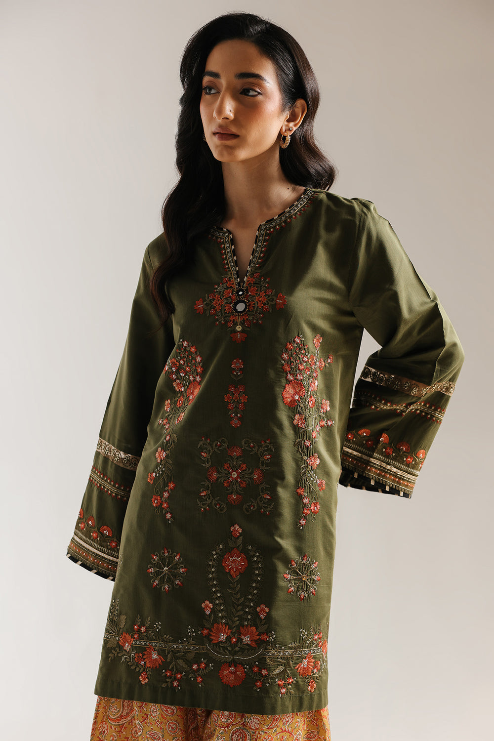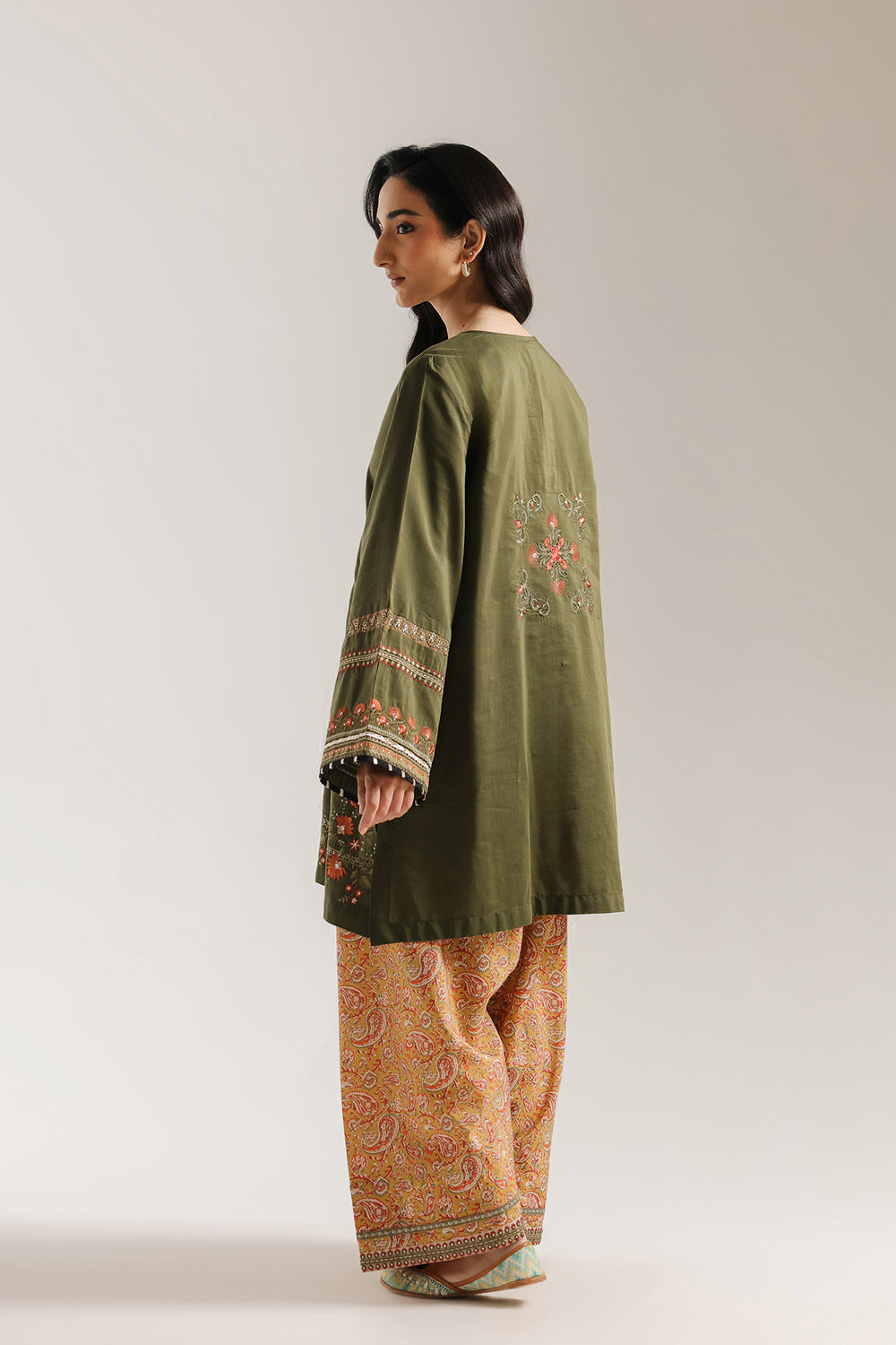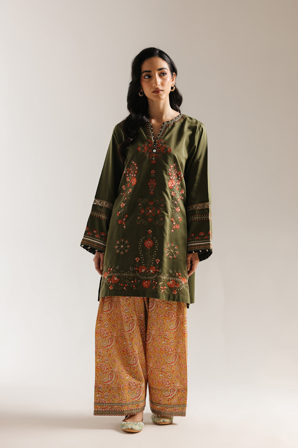 Make a grounded and artisanal statement with this olive-green suit, featuring a loose-fit shirt and coordinated printed shalwar. The shirt is designed with a split V-neckline and long sleeves, showcasing vertical sprays of vibrant coral and orange floral embroidery across the front. Intricate needlework borders also accent the cuffs and the hemline, adding a refined touch to the earthy tone of the fabric. This top is paired with voluminous, wide-leg shalwar featuring an all-over paisley print in warm ochre and rust tones, creating a rich contrast of patterns.
